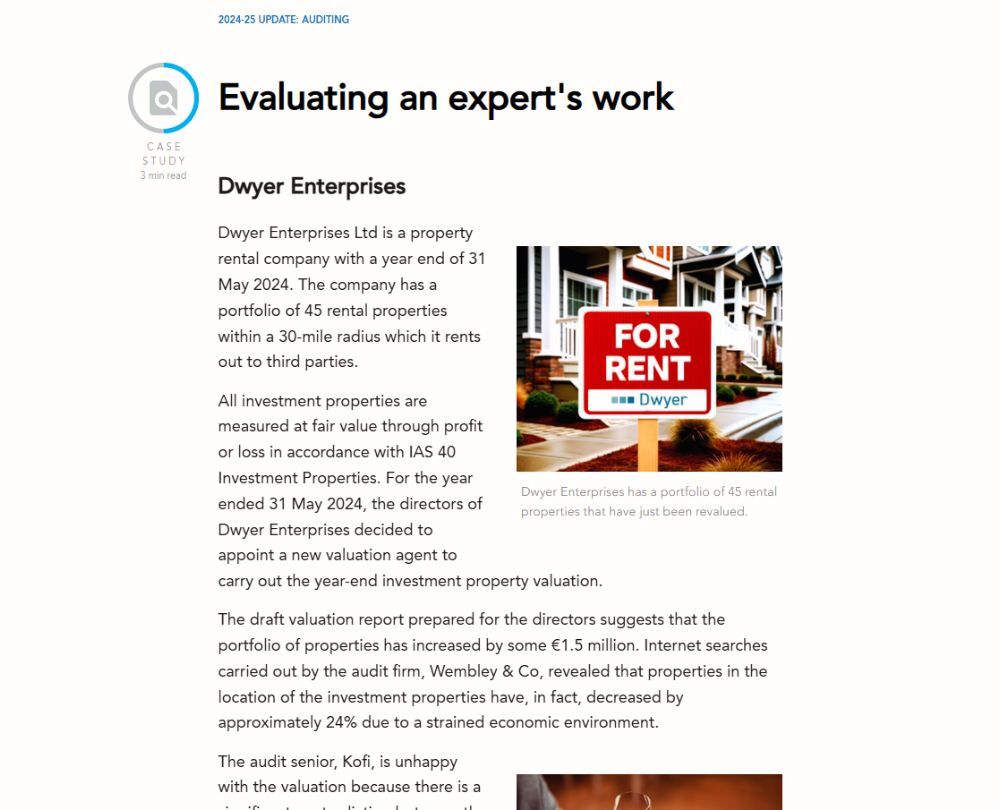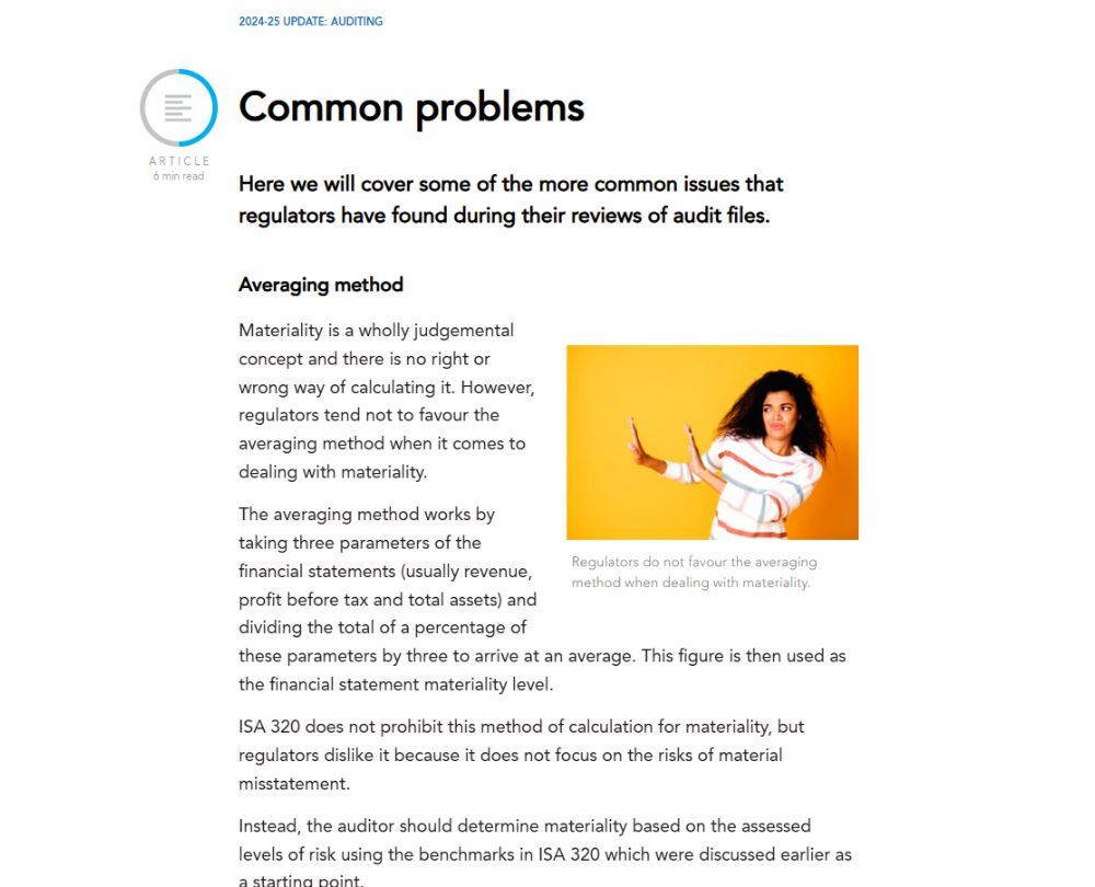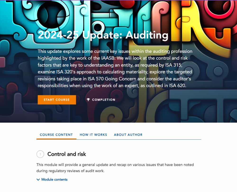 This course explores key current issues in auditing. It looks at control and risk factors key to understanding an entity, examines ISA 320's approach to calculating materiality, explores the IAASB’s targeted revisions proposed for ISA 570 Going Concern and considers an auditor's responsibilities when using the work of an expert.