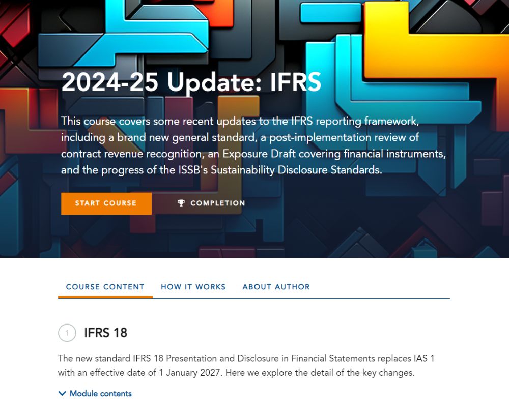 It starts by exploring IFRS 18, which will replace IAS 1 with an effective date of 1 January 2027. The course then dives into the details of the International Accounting Standards Board’s response to the issues raised by stakeholders in a post-implementation review of IFRS 15.