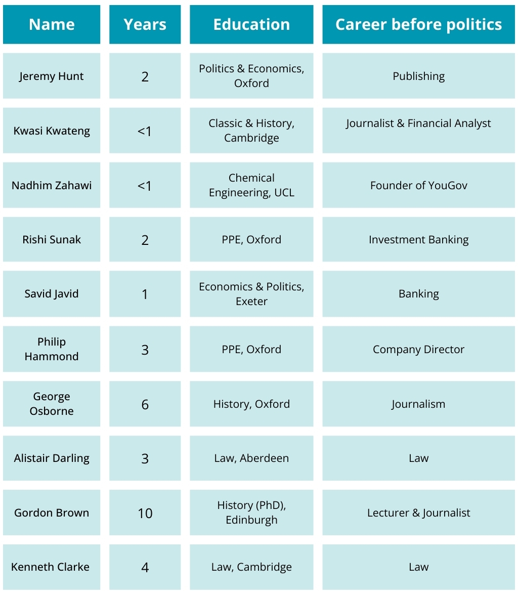 If we take a look at tenure -- assuming that staying in post and not getting sacked is a proxy for success in the role -- we find that both the longest serving Chancellors, Gordon Brown (10 years) and George Osborne (6 years), were not economists, but historians.