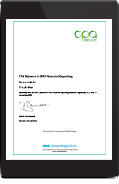 The CPA Diploma in IFRS Financial Reporting gives you everything you need to know about IFRS to enable you to apply the Standards accurately and appropriately. The knowledge is presented over nine sections, and concluded with a formal assessment. The Diploma is awarded by CPA Ireland, a founding member of the International Federation of Accountants (IFAC).