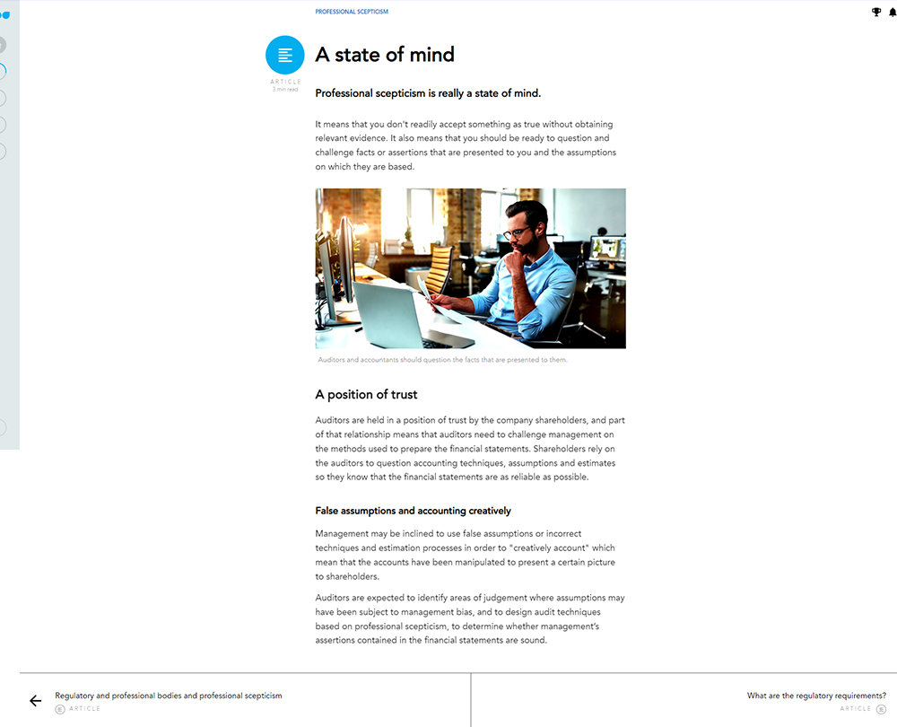 This course provides guidance on developing an attitude of professional scepticism with examples demonstrating the significance of judgement in financial accounting. Discover why being sceptical is described by the IAASB as the personal and professional responsibility of every accountant.