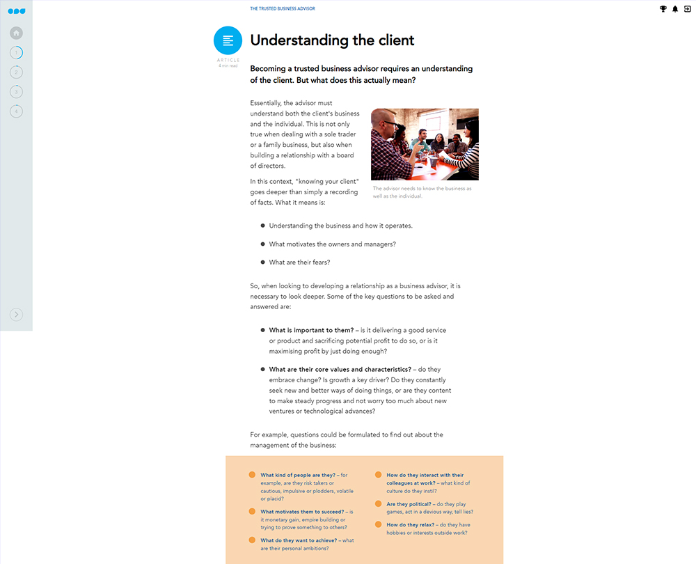 These days your clients are looking for more from their accountants, they want a trusted business advisor. This course looks at the processes, steps and technology that enable you to understand your clients' businesses, build stronger relationships and add real value.